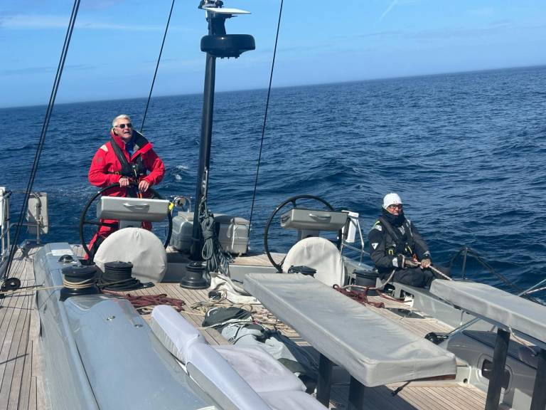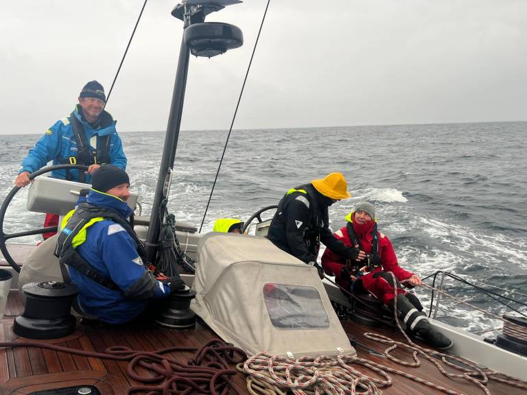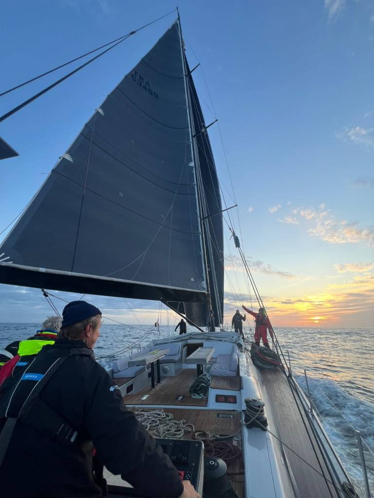 La nuit a été rude avec des pointes de vent à 32 nœuds dans une mer formée. Malgré une humidité importante et une mer très désordonnée, nous avons pu maintenir une bonne vitesse sous grand-voile 2 ris et J2.