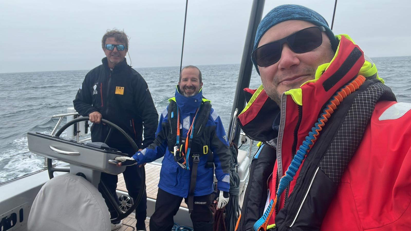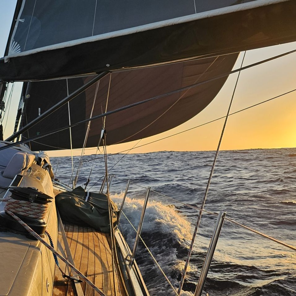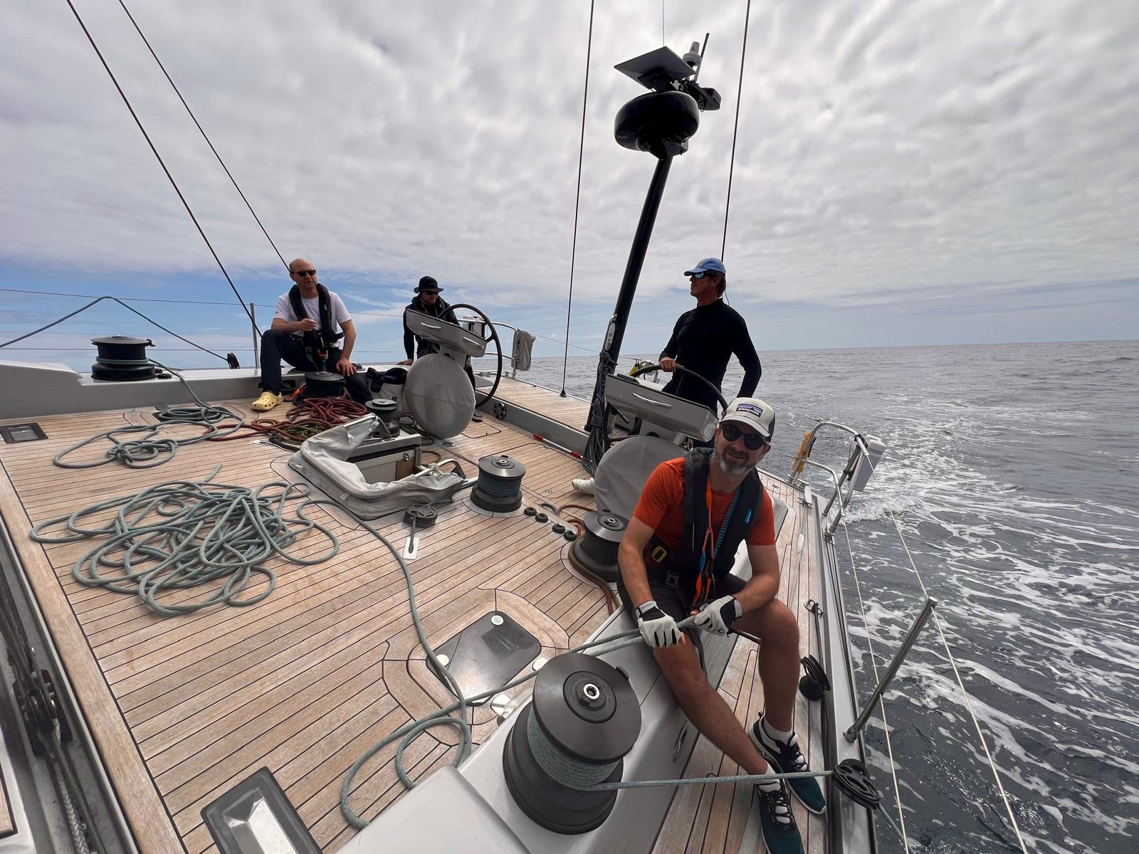 La nuit a été rude avec des pointes de vent à 32 nœuds dans une mer formée. Malgré une humidité importante et une mer très désordonnée, nous avons pu maintenir une bonne vitesse sous grand-voile 2 ris et J2.